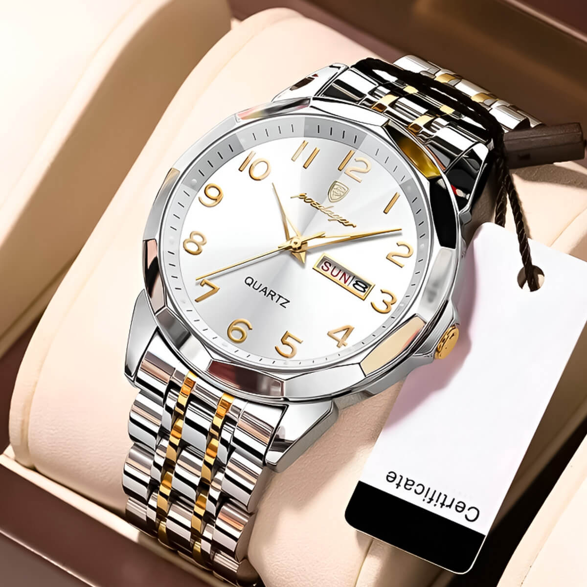El Poedagar (POE-3) es un reloj que redefine la elegancia masculina. Con un diseño en acero inoxidable plateado y una esfera blanco metálica, se convierte en un accesorio de impacto para el hombre moderno que busca estilo, precisión y resistencia en cada detalle.