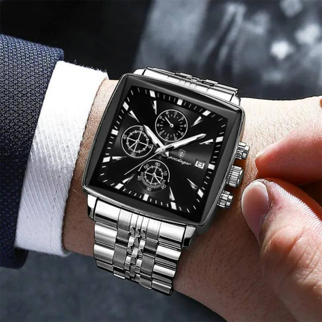 El Poedagar (POE-22) combina sofisticación moderna y resistencia diaria en un diseño que proyecta carácter y distinción. Con su caja plateada de acero inoxidable de 44 mm, esfera negra sobria y correa metálica de acabado pulido, este reloj ofrece un balance perfecto entre estilo ejecutivo y funcionalidad práctica.