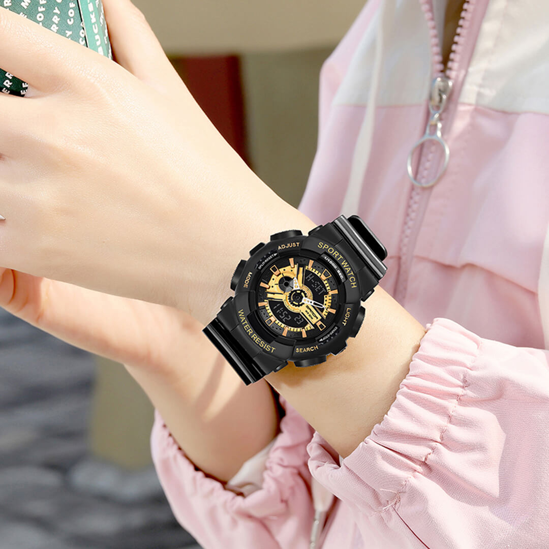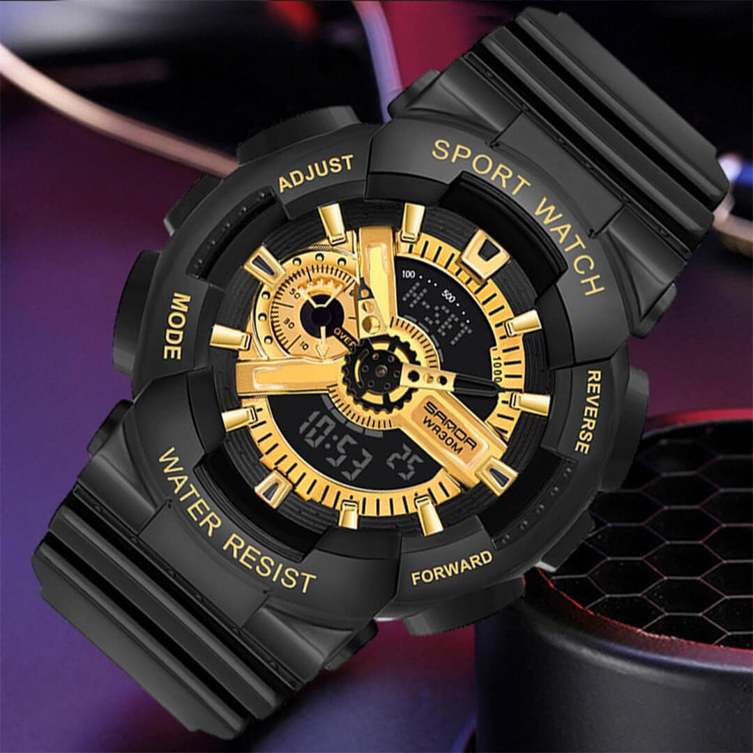 Reloj Sanda material de goma, color negro con dorado SAN-M-6 de moda con correa del mismo material, 100% original de fábrica, garantía 1 año, el acompañante perfecto para la mujer actual.