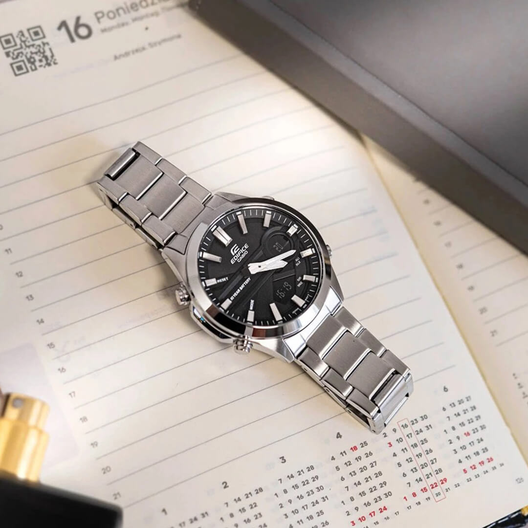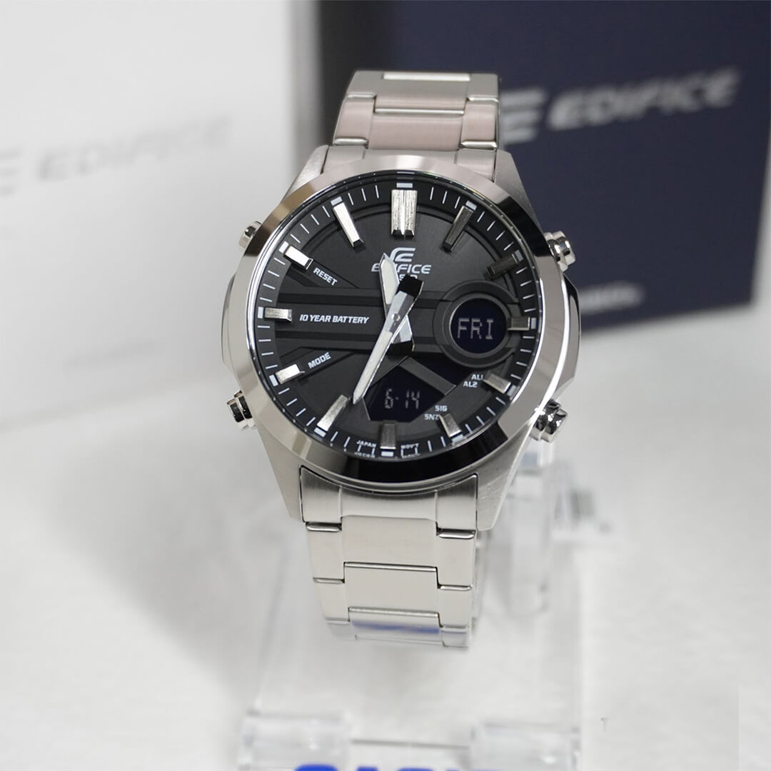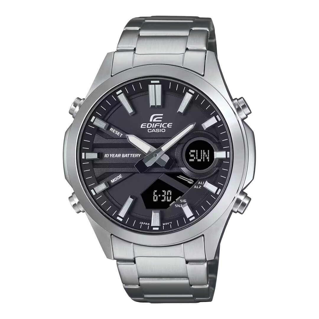El Edifice EFV-C120D-1A redefine la elegancia funcional: un reloj analógico-digital que combina la sofisticación del acero inoxidable con una batería de 10 años de duración, pensada para acompañarte sin interrupciones durante una década.