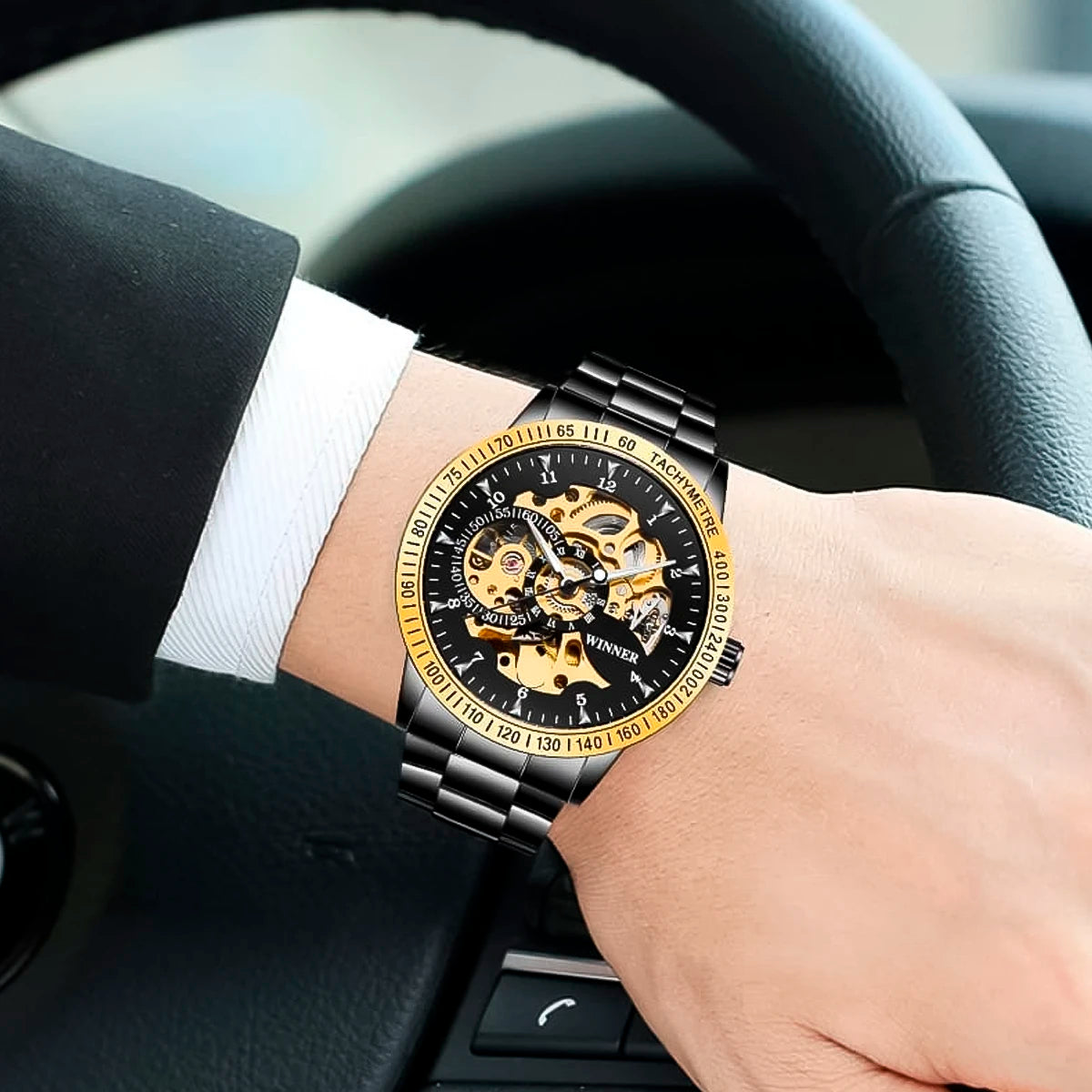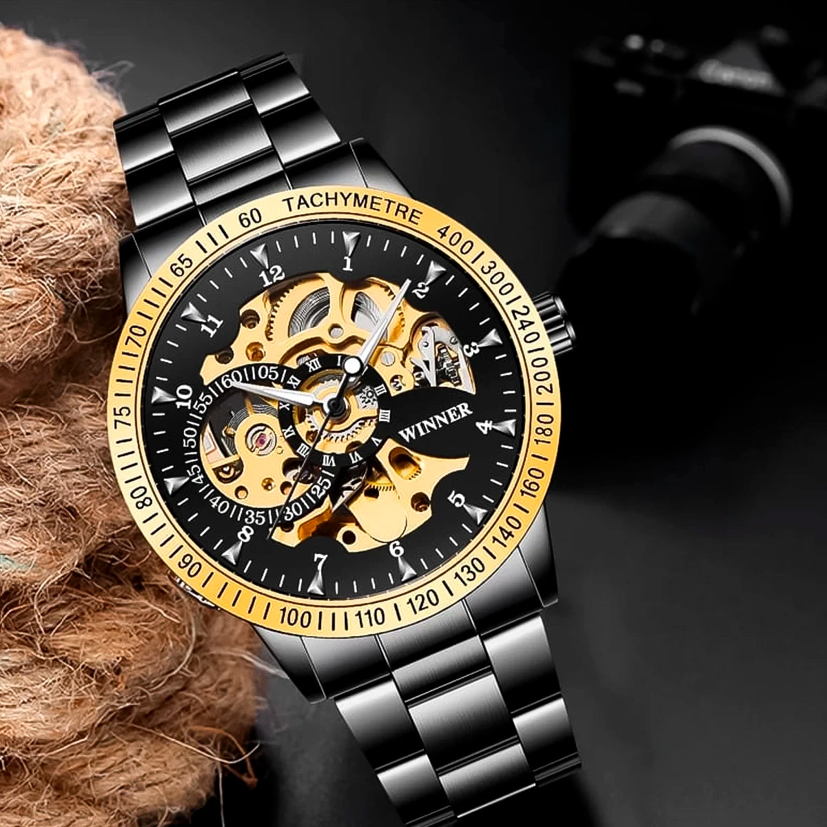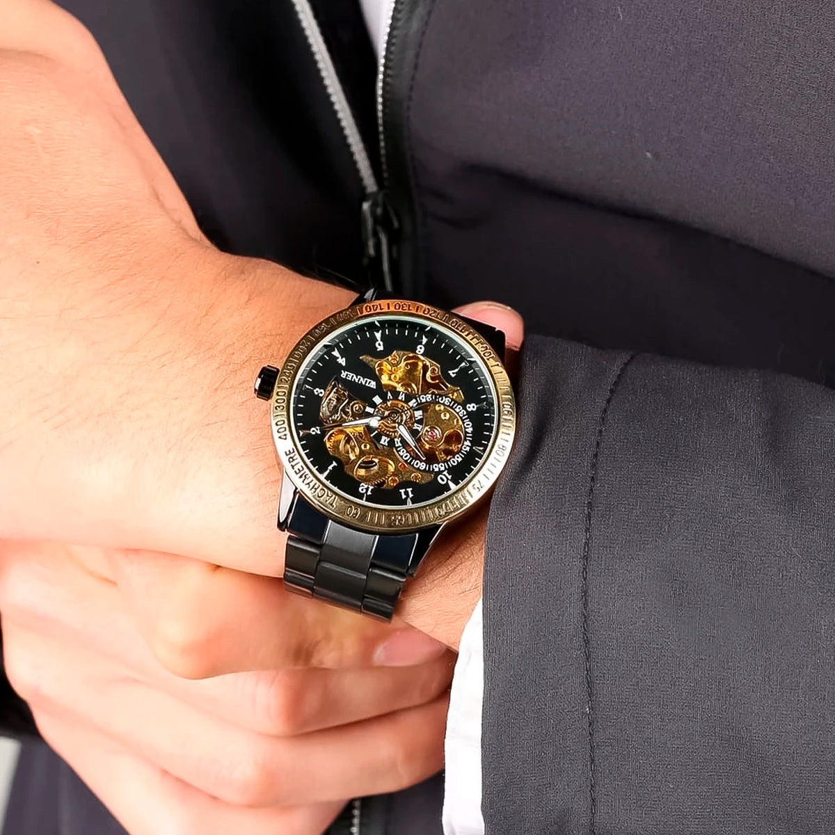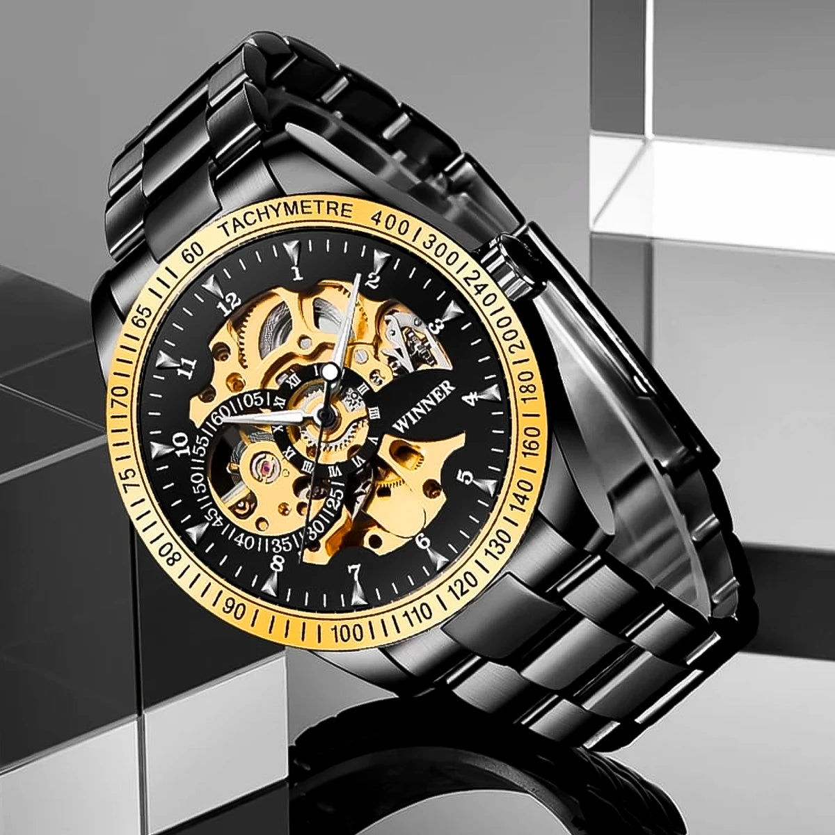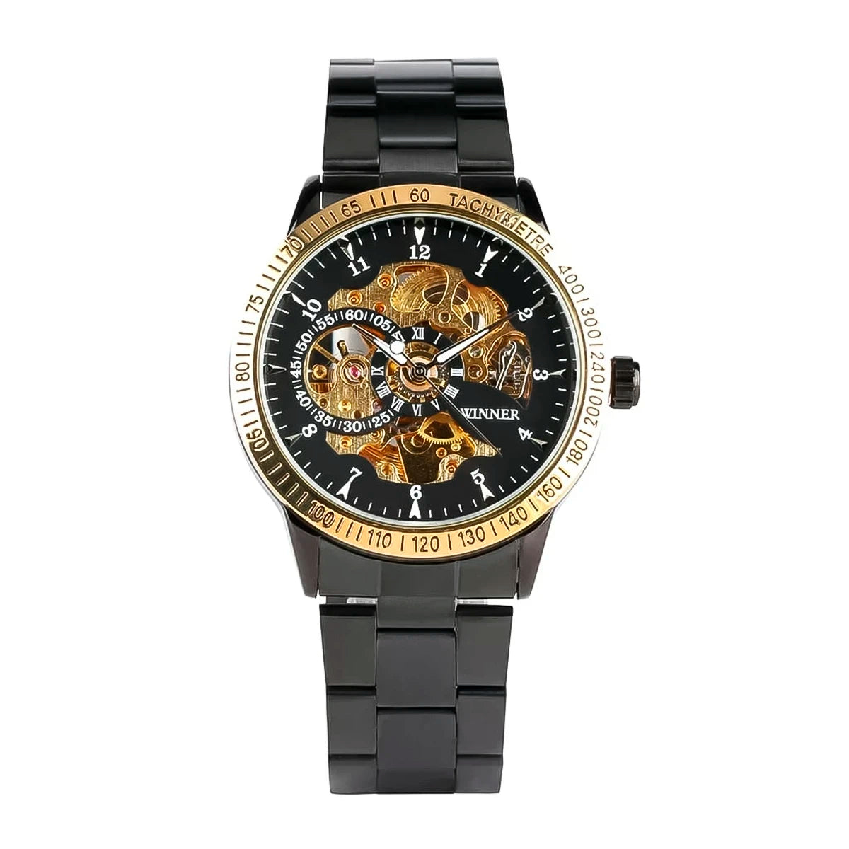 Reloj marca Winner Mecánico Black Gold WIN-10 de moda en acero inoxidable, 100% original de fábrica, garantía 1 año, el acompañante perfecto para el hombre actual.