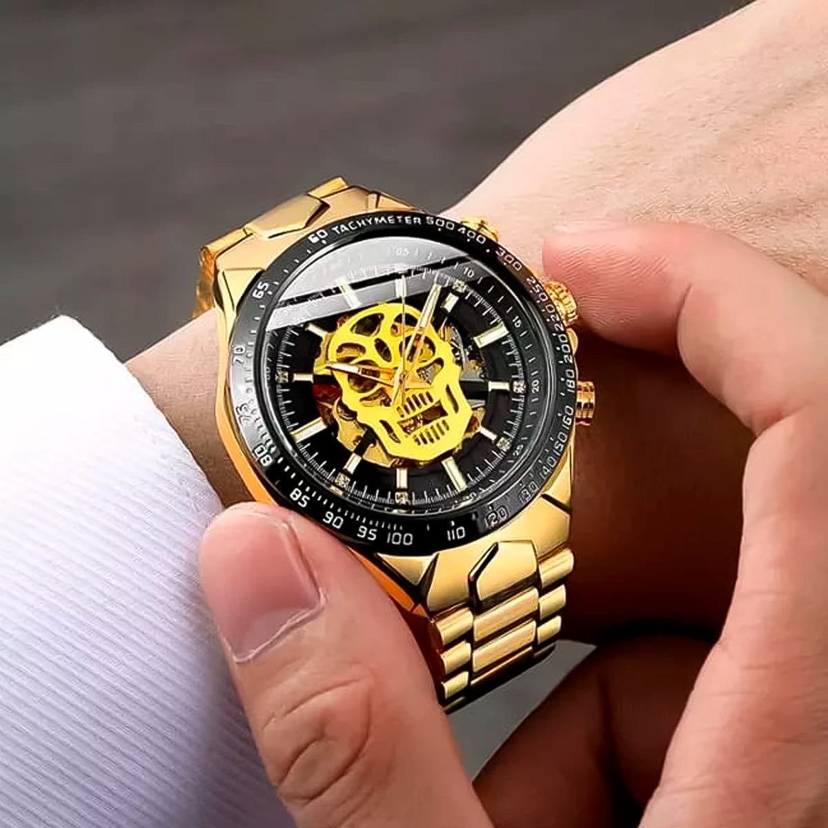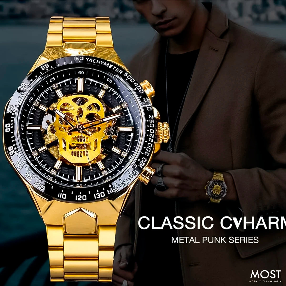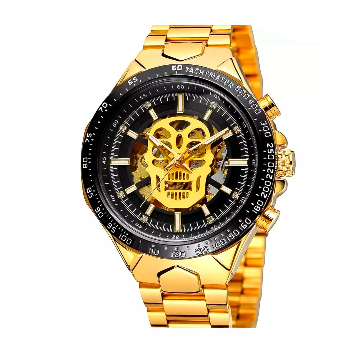 Reloj marca Winner Mecánico Dorado Esqueleto WIN-12 de moda en acero inoxidable, 100% original de fábrica, garantía 1 año, el acompañante perfecto para el hombre actual.