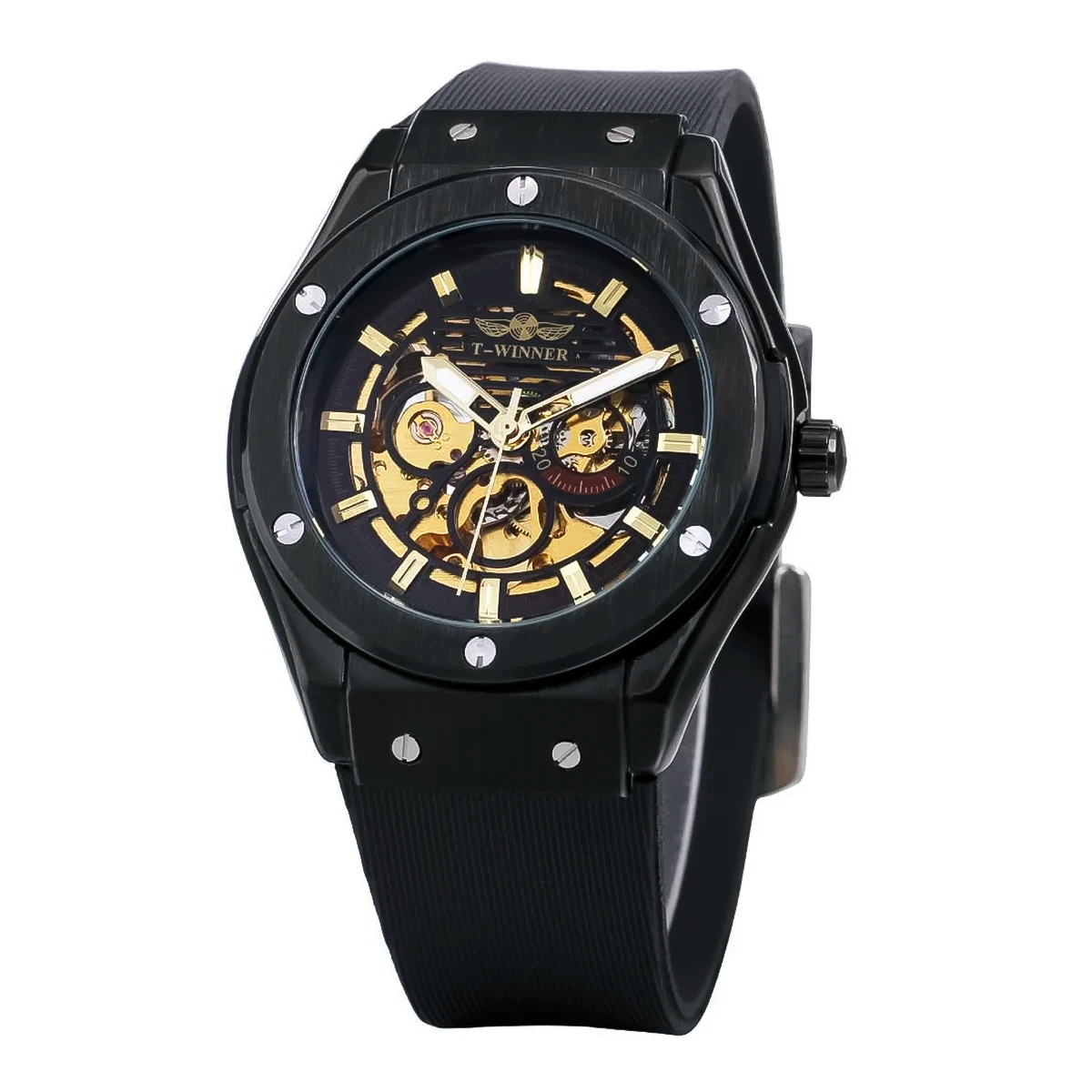 Reloj marca Winner Mecánico Automático Negro WIN-14 de moda con correa de silicona, 100% original de fábrica, garantía 1 año, el acompañante perfecto para el hombre actual.
