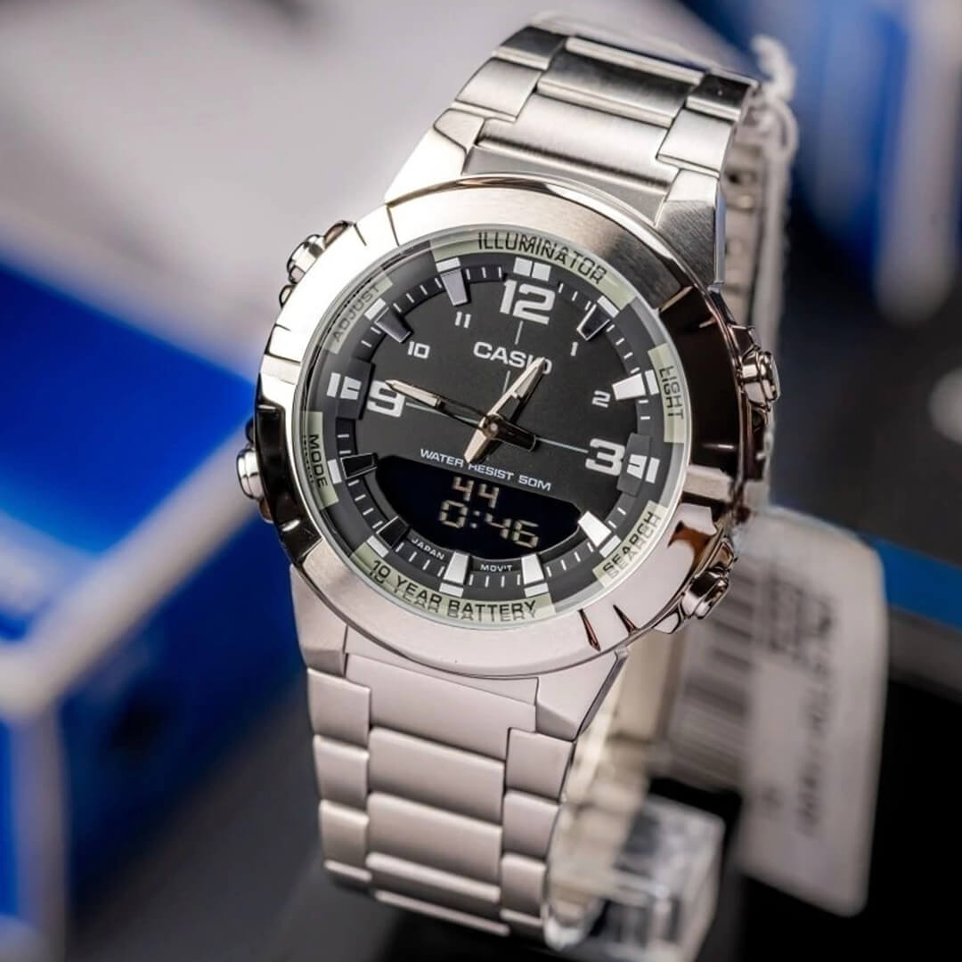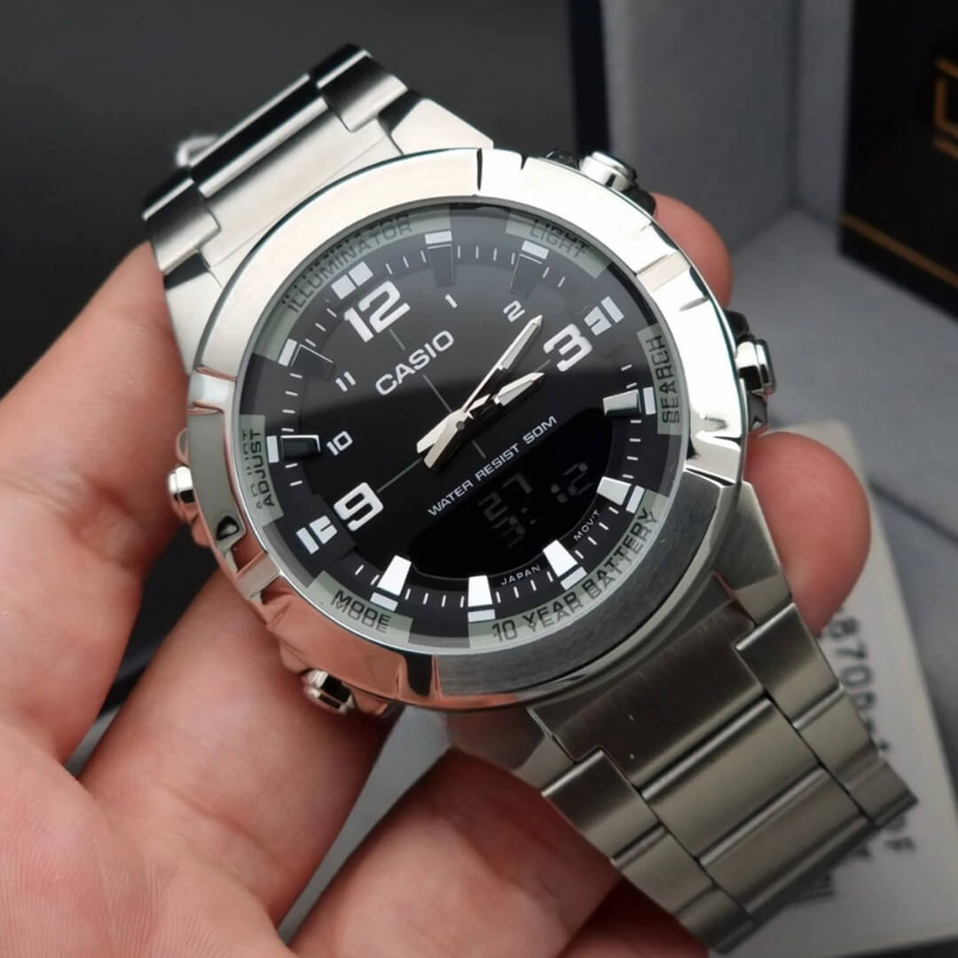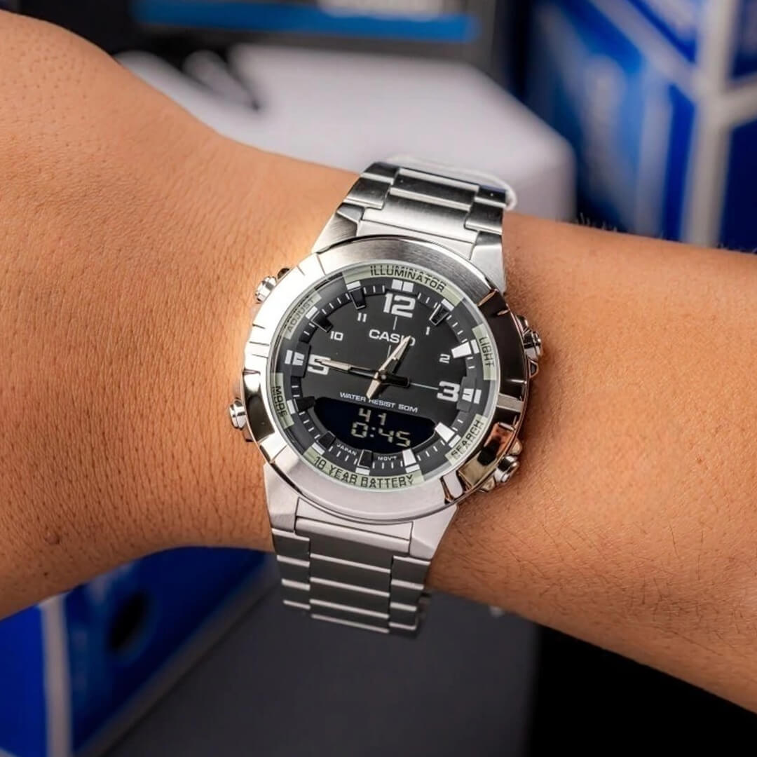El Casio AMW-870D-1AVDF (CAS-154) es un reloj analógico-digital diseñado para quienes exigen máxima funcionalidad, resistencia y un estilo deportivo refinado. Combina una robusta caja y correa de acero inoxidable resistente, logrando un equilibrio perfecto entre presencia, durabilidad y uso diario intensivo.
