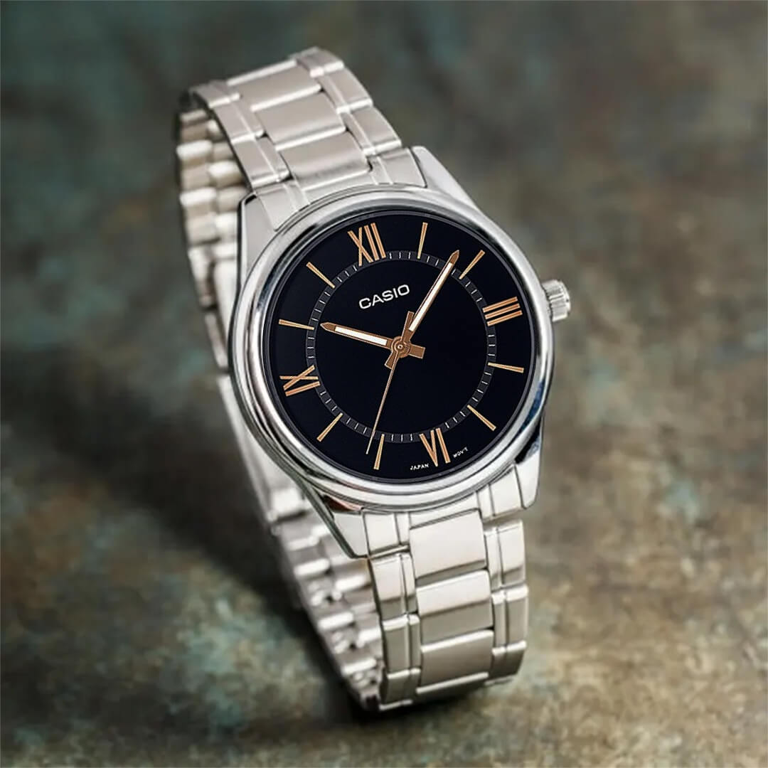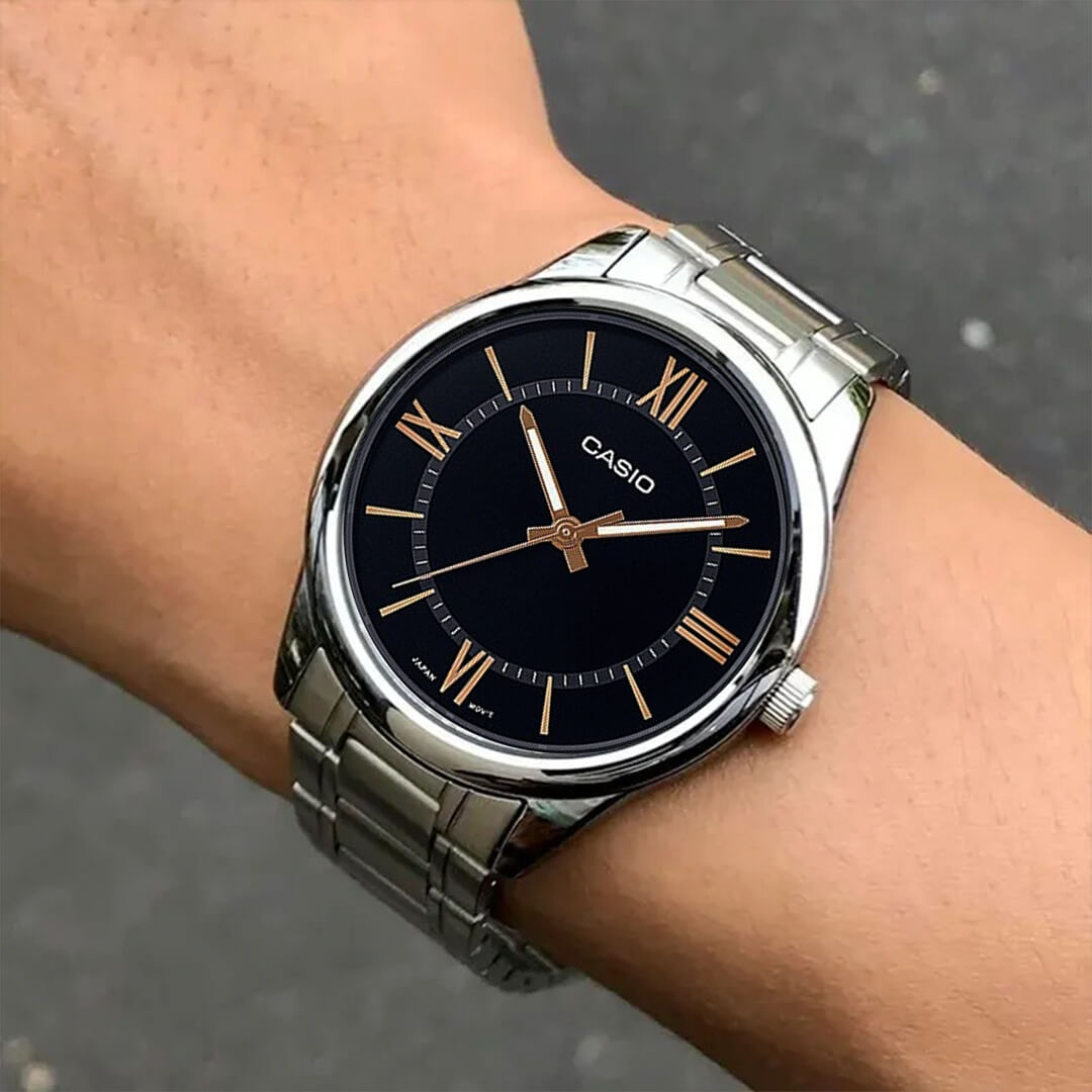 El Casio MTP-V005D-1B5 (CAS-12) redefine la elegancia funcional con su diseño clásico de números romanos, ideal para quienes valoran el equilibrio entre tradición, estilo y precisión. Inspirado en los relojes de vestir atemporales, este modelo ofrece una esfera negra contrastada con detalles plateados, perfecta para el entorno laboral o eventos formales.