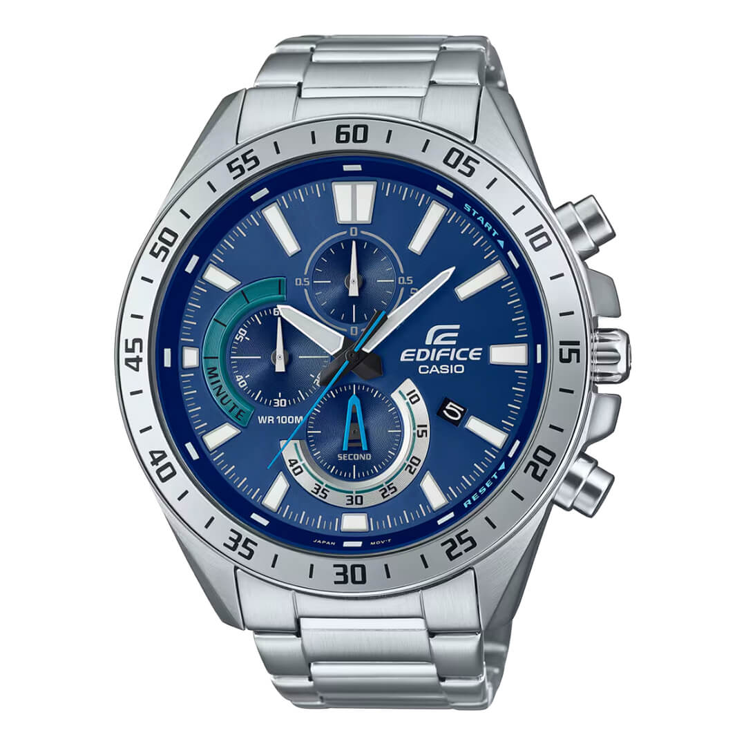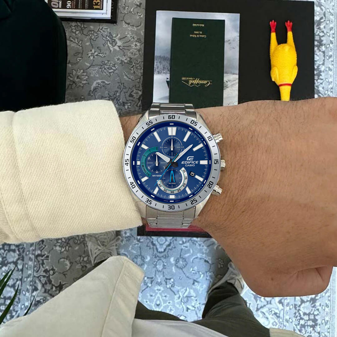 El Edifice EFV-620D-2A redefine la elegancia deportiva con un diseño inspirado en el mundo del automovilismo profesional. Su estructura robusta de acero inoxidable y su carátula azul profundo con detalles metálicos evocan la estética y la velocidad de los motores de alto rendimiento.