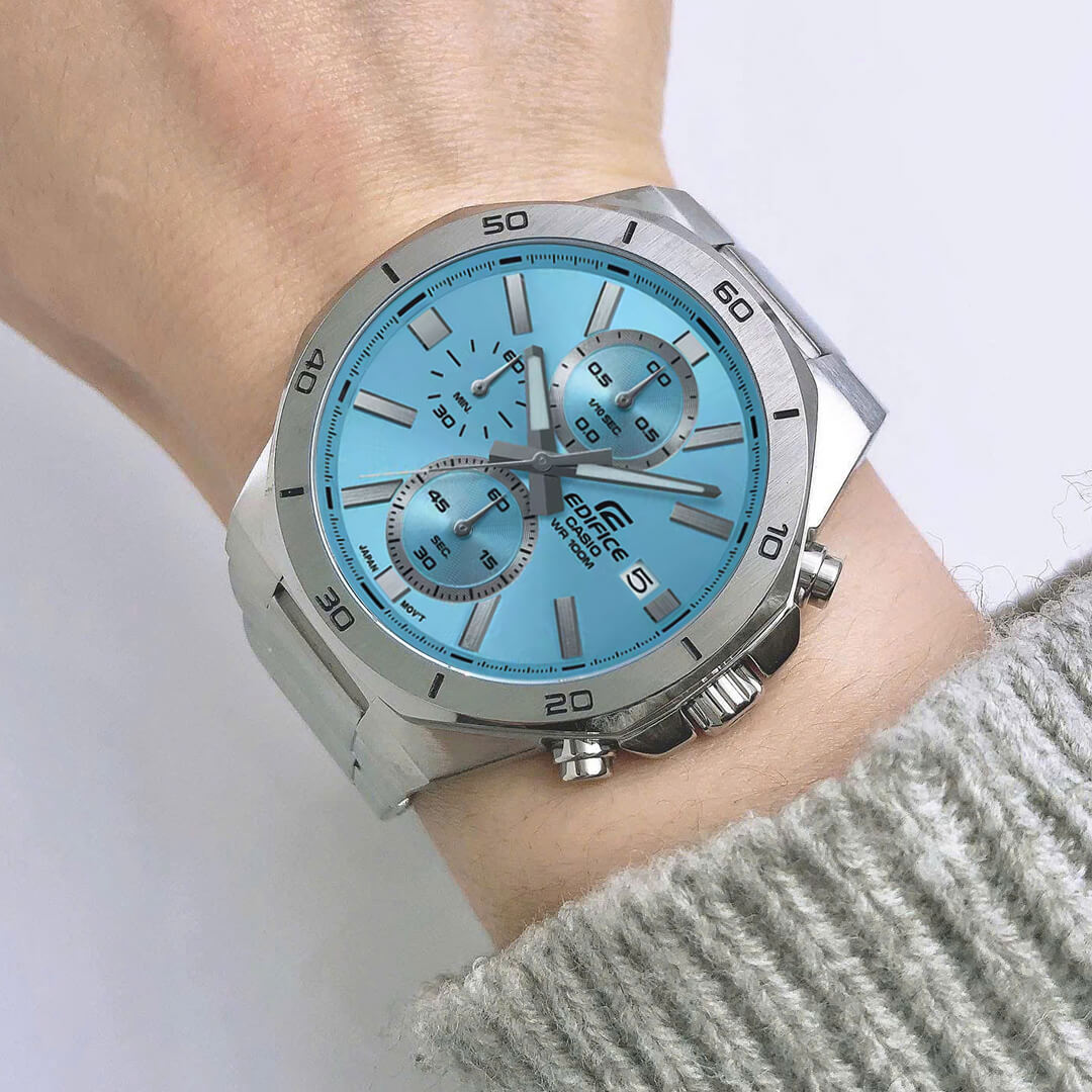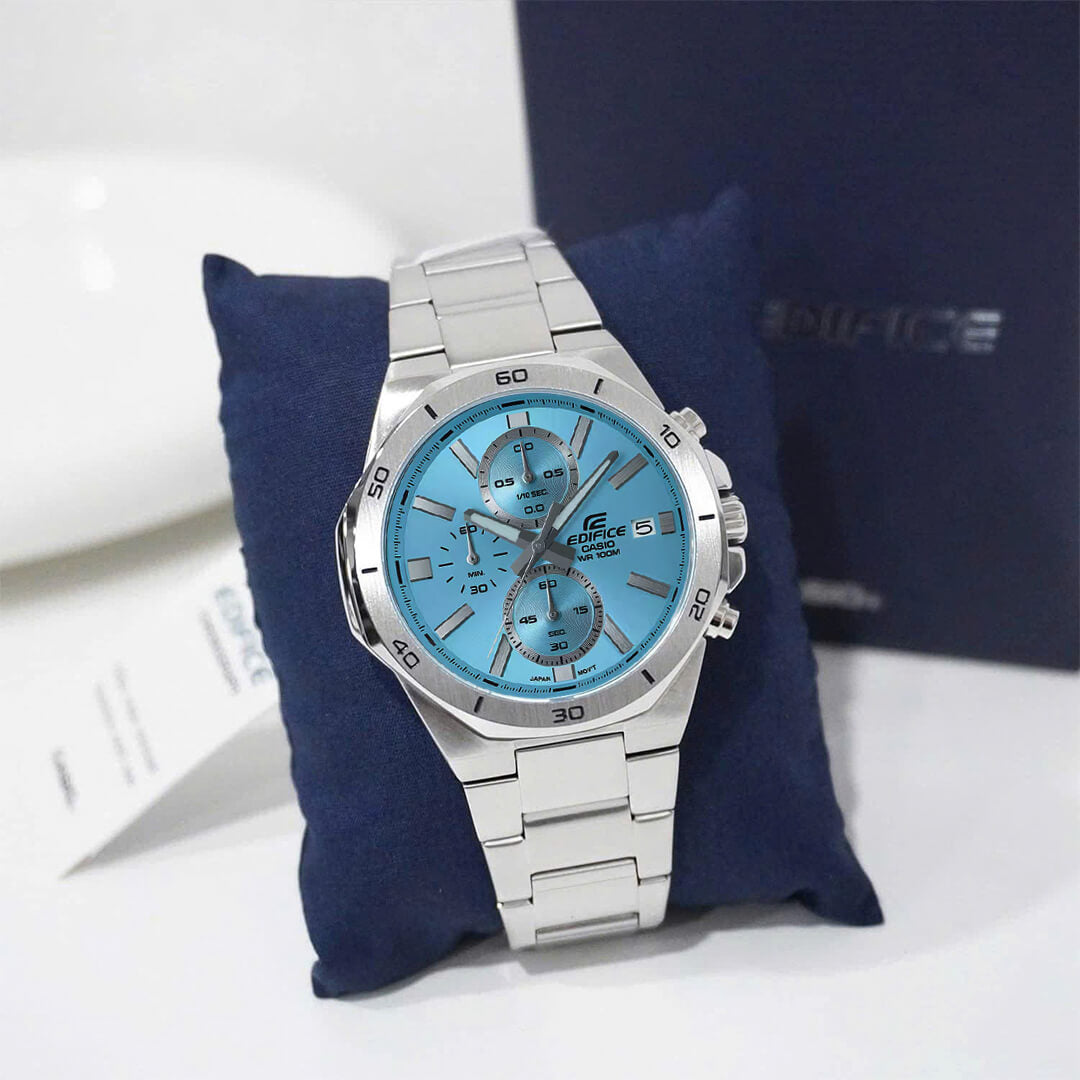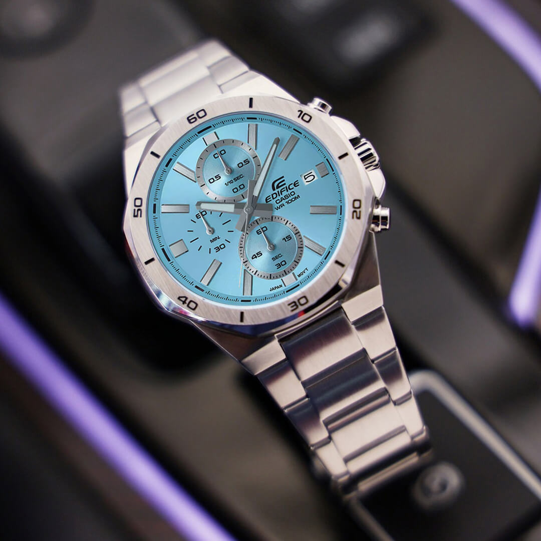 El Edifice EFV-640D-2B (EDF-31) redefine el concepto de sofisticación deportiva. Este cronógrafo clásico de líneas robustas y diseño octogonal integra una esfera azul vibrante, que equilibra potencia visual con refinamiento contemporáneo. Cada detalle —desde el pulido del bisel plano hasta los laterales con acabado espejo— está pensado para proyectar una estética precisa, profesional y dinámica.