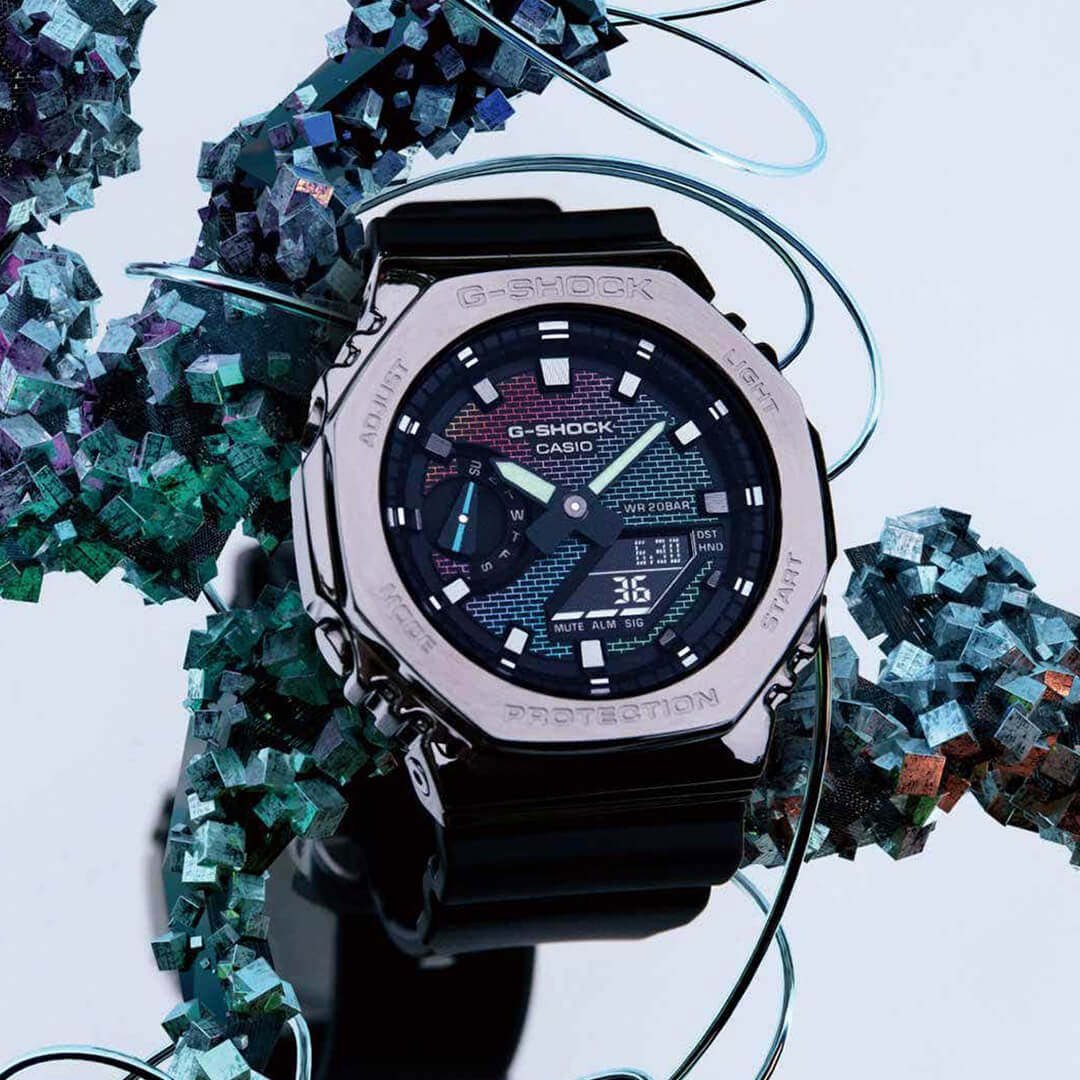 El G-Shock GM‑2100RW‑1A (G-SK-200), un modelo analógico-digital que mezcla el diseño octogonal de culto con un espectáculo de color arcoíris inspirado en murales urbanos. Este reloj no solo es una pieza de ingeniería resistente: es una declaración de estilo. Su esfera con patrón de ladrillo iridiscente cambia de tonalidad con la luz, evocando la energía vibrante de las calles y la actitud desafiante que define a G-Shock desde su nacimiento.