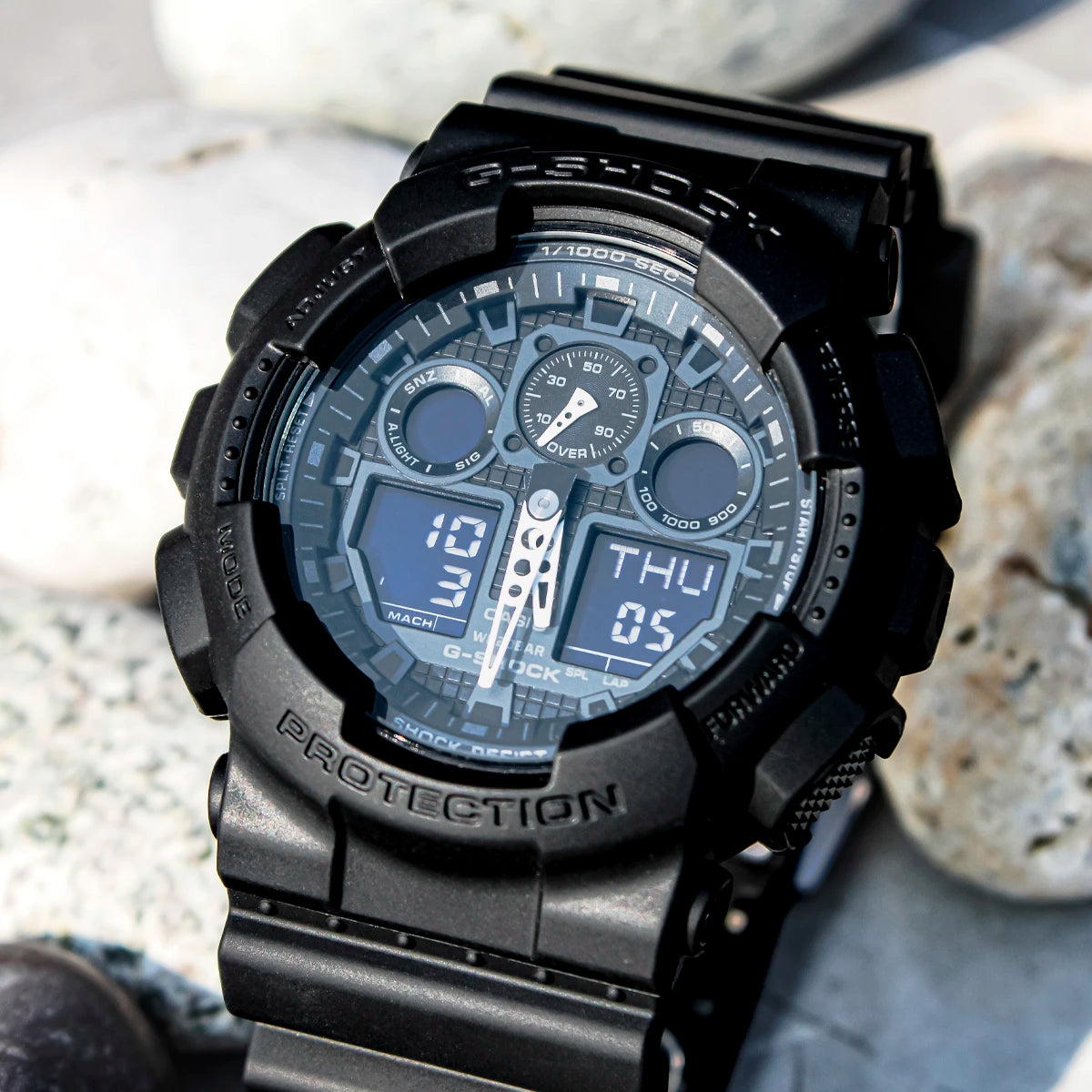 De G-SHOCK, el G-SK-3 es de los sólidos relojes que evolucionan en una búsqueda infinita de resistencia, este modelo de combinación fusiona pantallas analógicas y digitales. Equipado con un cronómetro de medición en milisegundos y un velocímetro. Presenta resistencia magnética de clase 1 de la norma JIS y una practicidad excelente. El diseño de la esfera consta de cuatro pantallas LCD grandes con manecillas de minutos y hora de aluminio grandes que son livianas y tienen una resistencia a los impactos excelente. Las pantallas analógicas y digitales están dispuestas simétricamente, lo que le proporciona un diseño dinámico a la esfera.