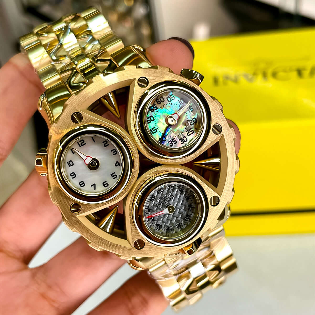 Este hermoso reloj Invicta Cerberus (INV-296) contiene un preciso movimiento de cuarzo además de una caja de oro. Su esfera muestra una esfera de metal, nácar, abulón y fibra de vidrio protegida por un cristal mineral de alta resistencia. Este reloj se completa con una correa de acero inoxidable dorada y ofrece resistencia al agua de hasta 100 metros.