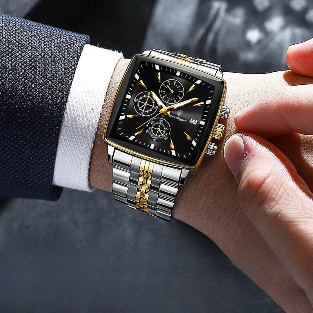 El Poedagar (POE-28) combina sofisticación moderna y resistencia diaria en un diseño que proyecta carácter y distinción. Con su caja plateada de acero inoxidable de 44 mm, esfera negra y correa metálica de acabado pulido con toques dorados, este reloj ofrece un balance perfecto entre estilo ejecutivo y funcionalidad práctica.