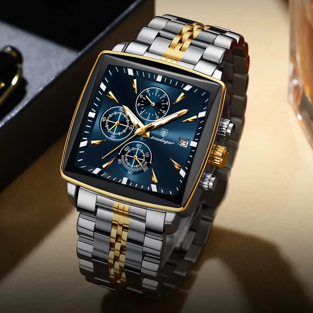 El Poedagar (POE-29) combina sofisticación moderna y resistencia diaria en un diseño que proyecta carácter y distinción. Con su caja plateada de acero inoxidable de 44 mm, esfera azul y correa metálica de acabado pulido con toques dorados, este reloj ofrece un balance perfecto entre estilo ejecutivo y funcionalidad práctica.